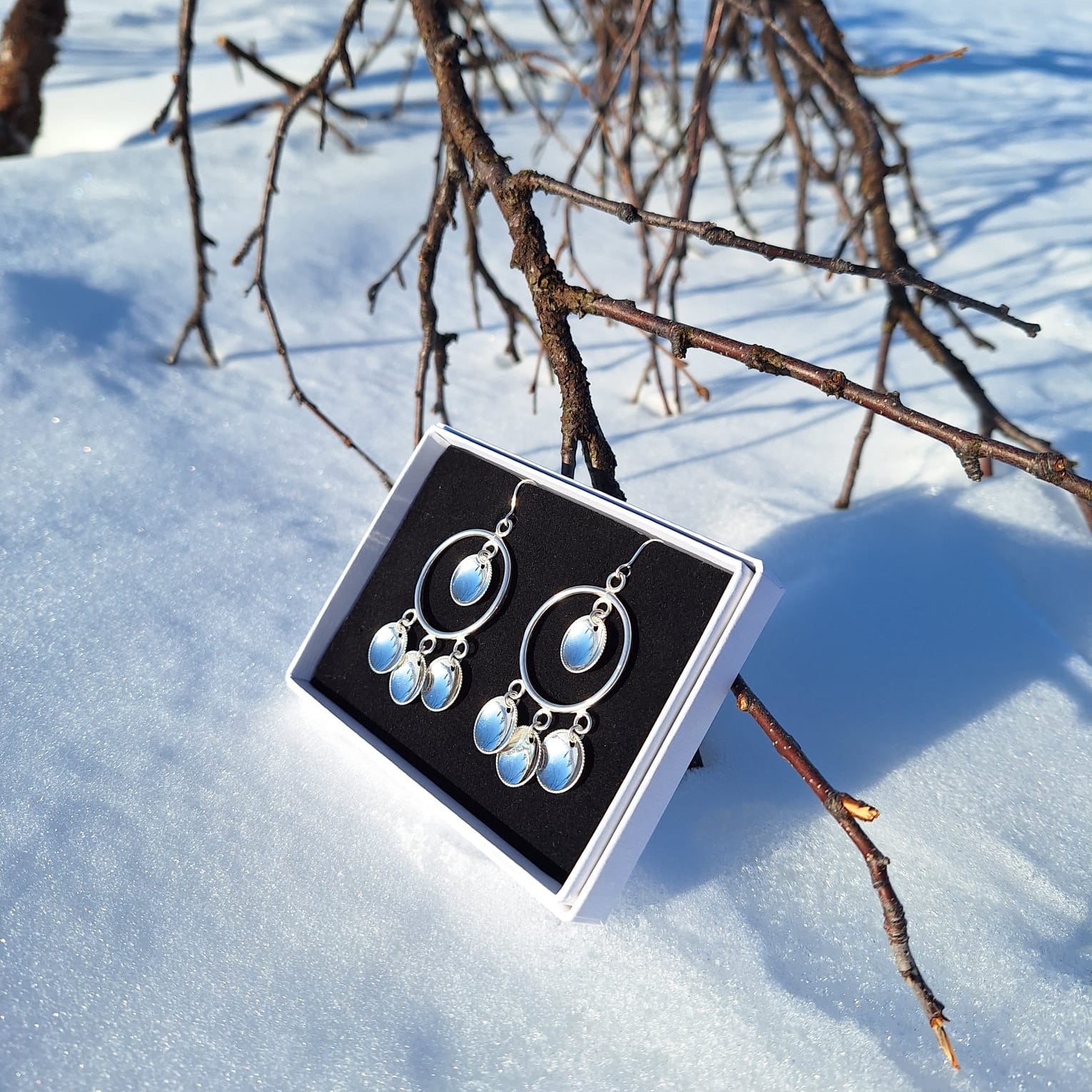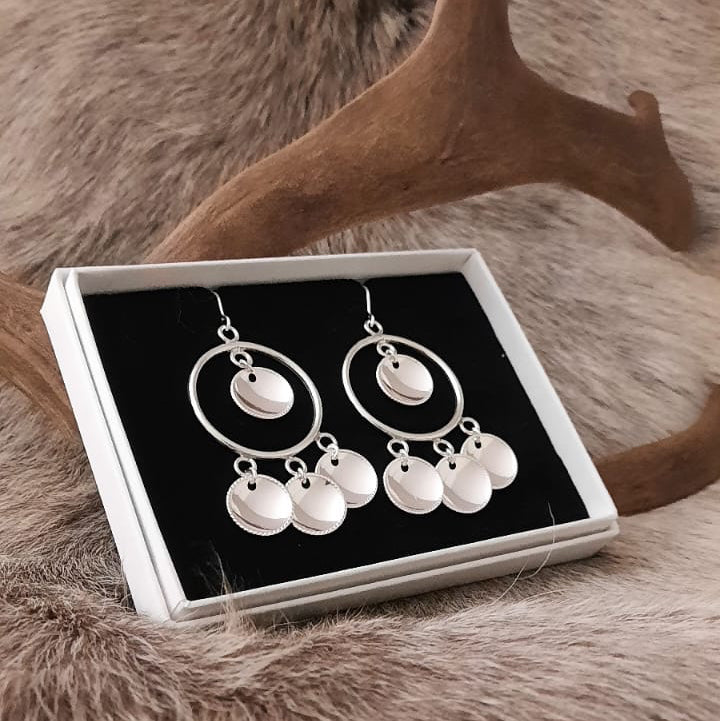 Korvakorujen materiaalina on laadukas 925-hopea, ja se yhdistää saamelaisen muotokielen moderniin ilmeeseen. Liikkuvat elementit tuovat korun eloon – jokainen liike saa sen säihkymään valossa kuin pohjoisen kevätpäivä tai kesäyö.