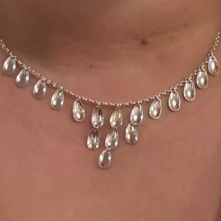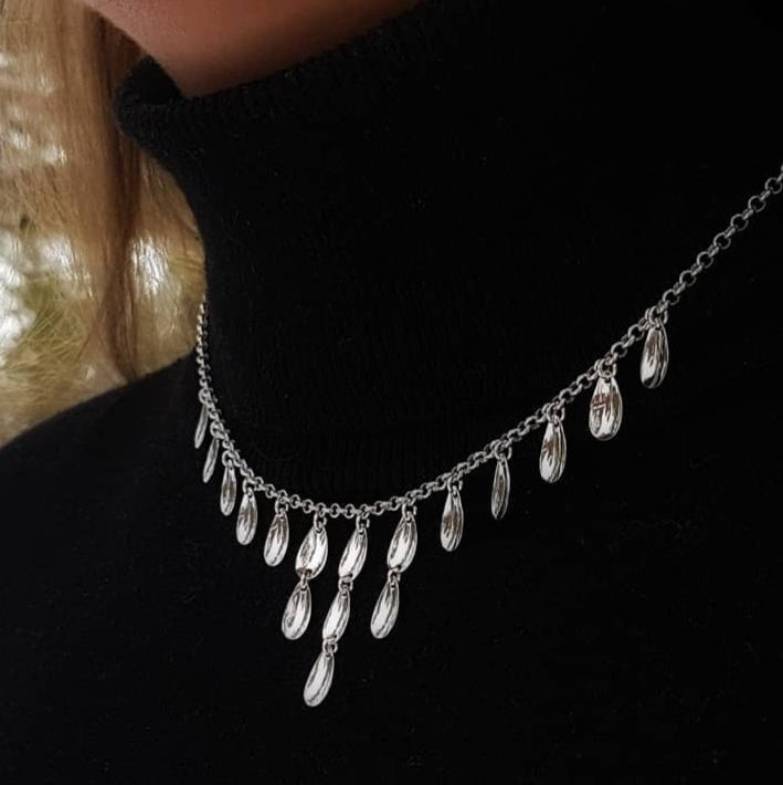 Bálggis-kaulakoru on ajaton ja hillitty koru, joka yhdistää yksinkertaisen muodon ja perinteisen käsityön kauneuden. Ketju on valmistettu hopeasta 925, ja sen koristeena on 17 pisaralaukkasta hopeaa 830, jotka tuovat kaulakoruun hienostunutta rytmiä ja eloisuutta.