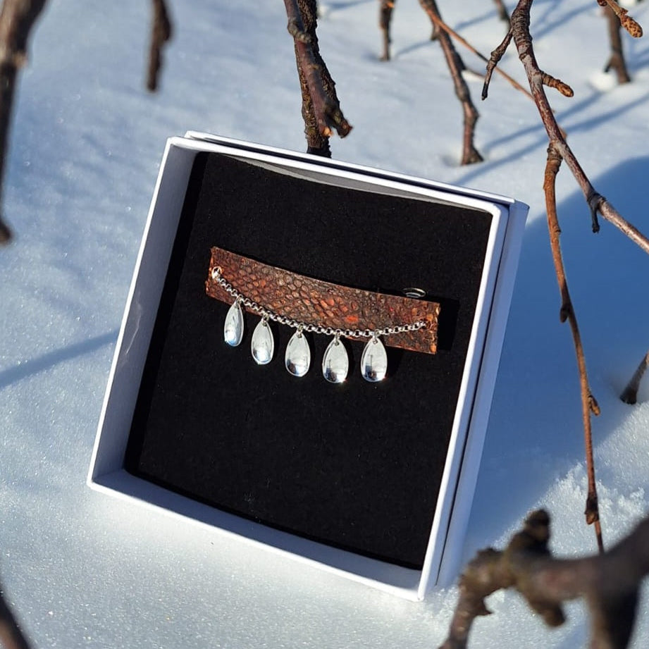 Mateennahan pintaa täydentävät laukkasten ketju, jotka keinuvat ja kimmeltävät liikkeessä. Viisi pisaran muotoista laukkasta luovat hiuksiisi elävän ja kauniin yksityiskohdan, joka herättää huomiota.