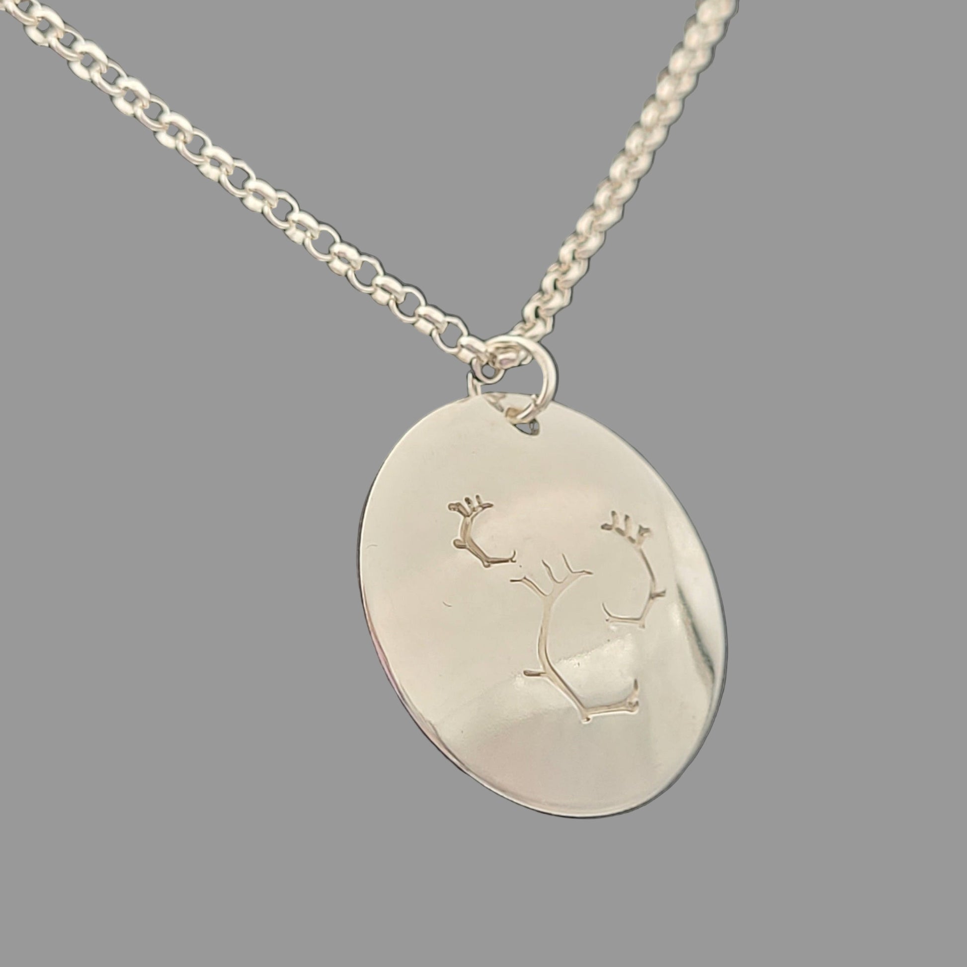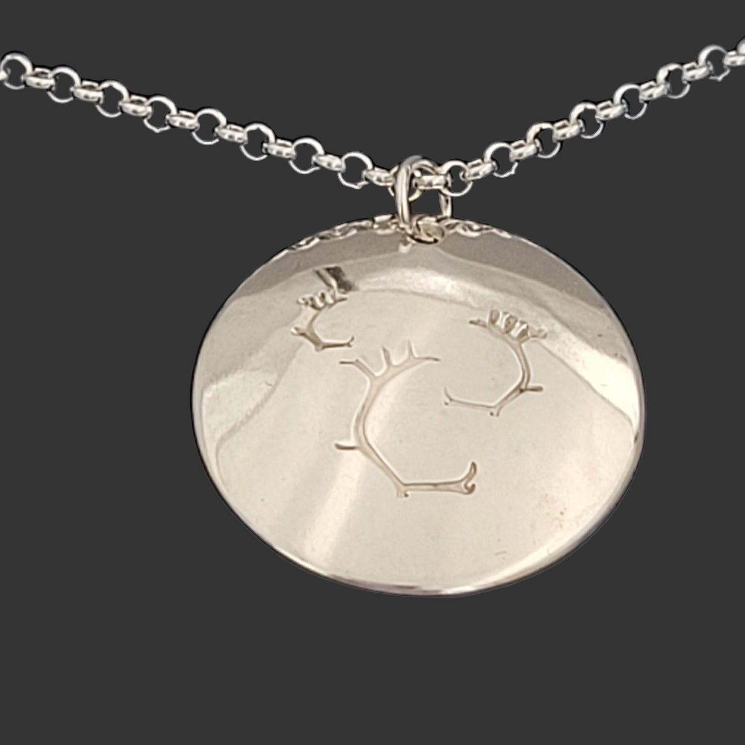 Váimmueana-kaulakoru kantaa mukanaan selkeää ja rauhallista kauneutta. Korun hopeinen (925) riipus on halkaisijaltaan noin 2 cm, ja sen sileä muotoilu heijastaa valoa hillitysti. Korua koristaa kolmen sarven kuvio, joka kuvastaa lapsia, vanhempia ja isovanhempia ja sitä miten yhteisöllisyys on tärkeää. Sopii sekä arkeen että juhlaan, yksinään tai muiden korujen rinnalle.
